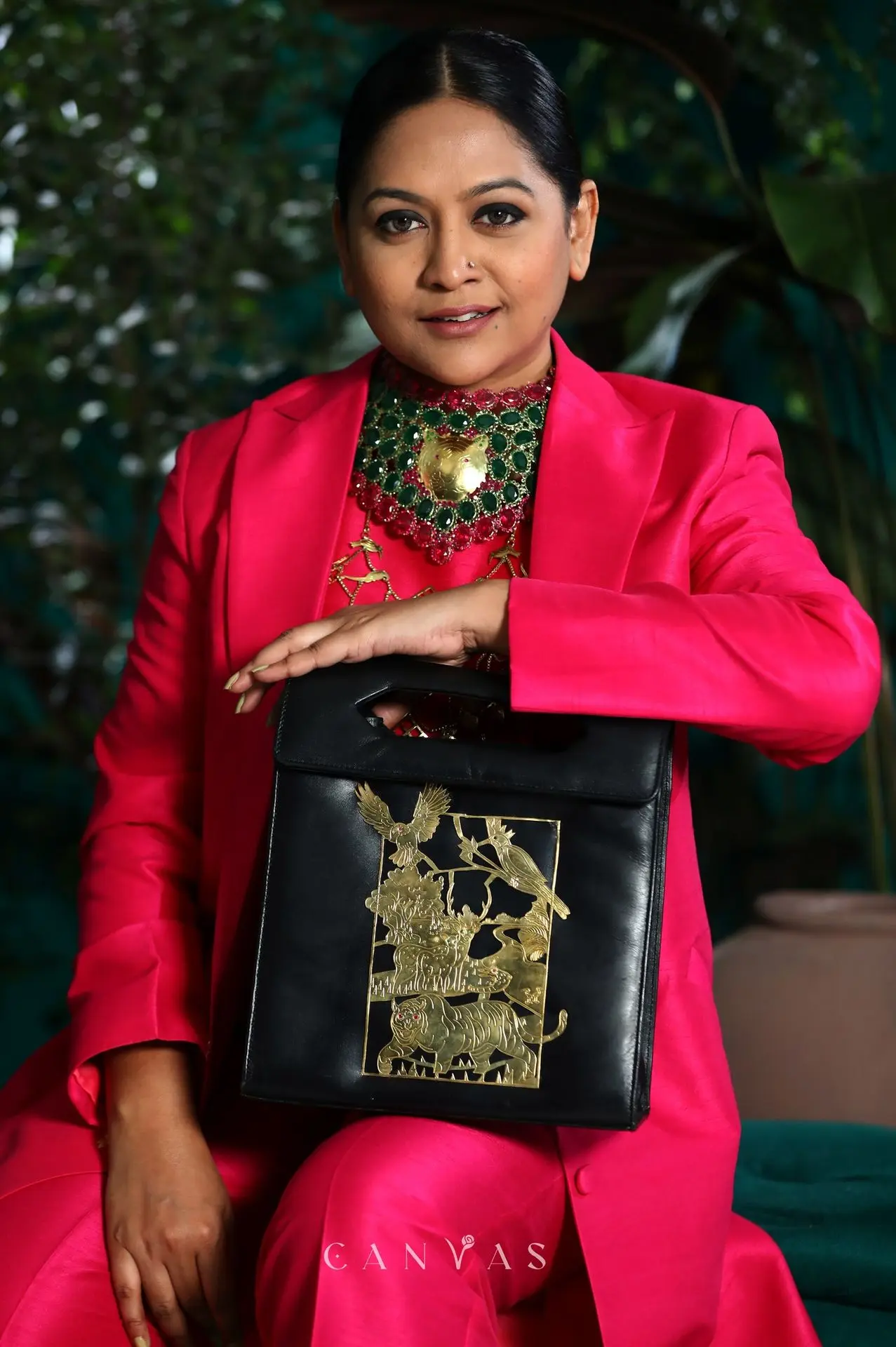 ๐๐๐ง๐๐๐๐ โ Crafted with pure, eco-friendly leather and reusable brass, this design captures the essence of the Sundarbans, showcasing the tiger, deer, birds, river elements, and dried summer plants. The brass handle adds a luxurious yet sustainable touch.